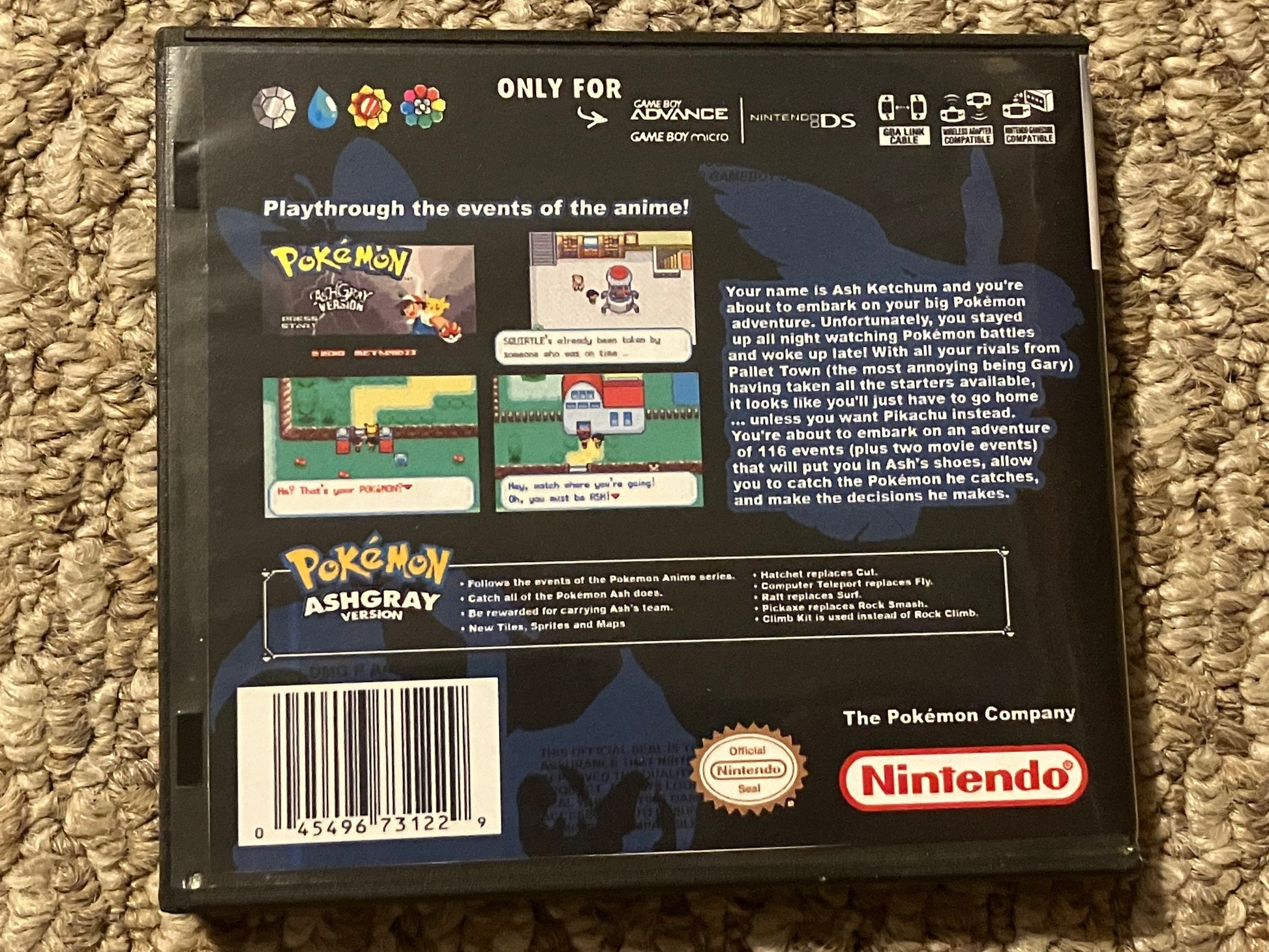 Pokemon Ash Gray for Game Boy Advance. Will come in a game case with artwork. The game is in English, region free, works great and is able to save.